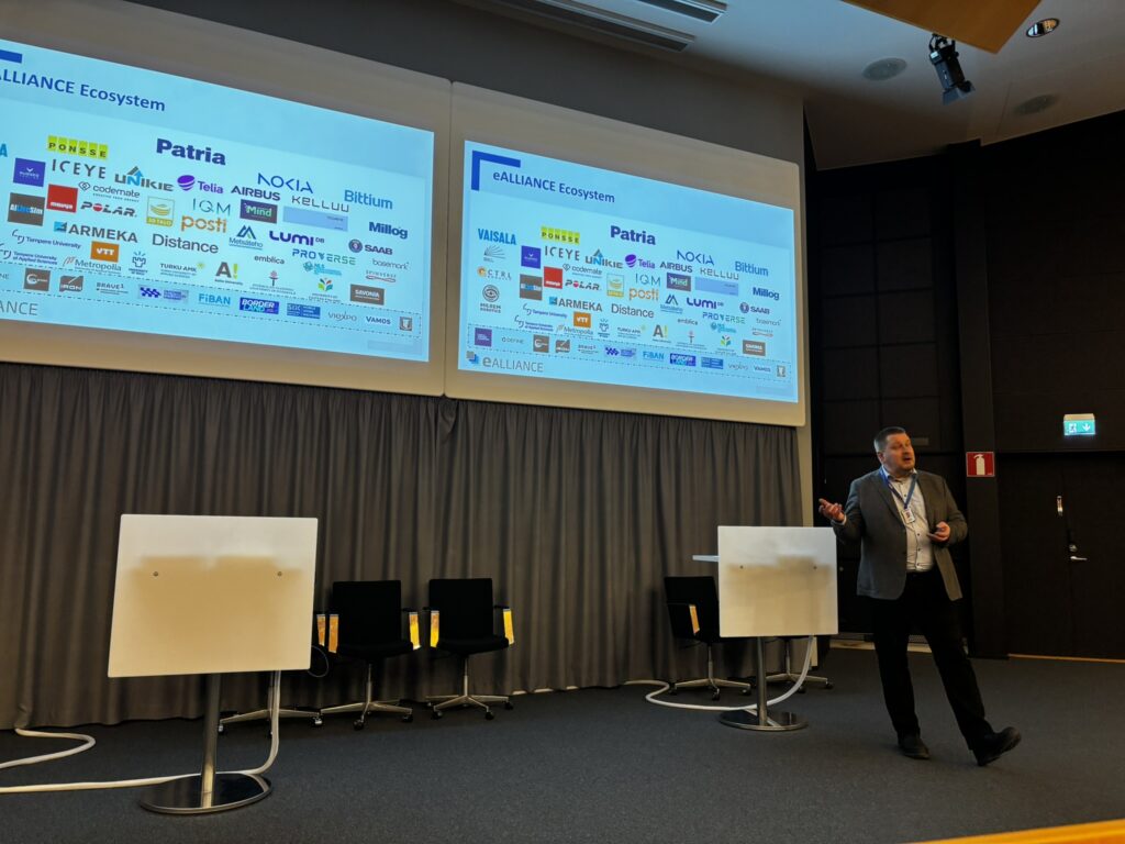Besöket hos Patria inleddes med att företagen fick en genomgång av eALLIANCE-veturiprogrammet, ett av Business Finlands mest omfattande innovationsinitiativ. Här fick de deltagande företagen även möjlighet att hålla tre minuters pitchar direkt till Patria – ett konkret tillfälle att positionera sitt kunnande.