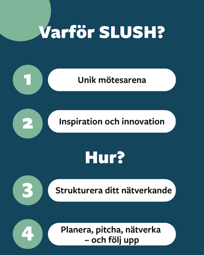 Unik mötesarena: SLUSH, inklusive dess alla sidoevenemang, är en unik arena för entreprenörer, forskare, investerare och ekosystemutvecklare. För företagare och aktörer i Jakobstadsregionen kan deltagande öppna dörrar till internationella partnerskap, nya marknader och insikter i trender och innovationer som annars är svåra att nå.